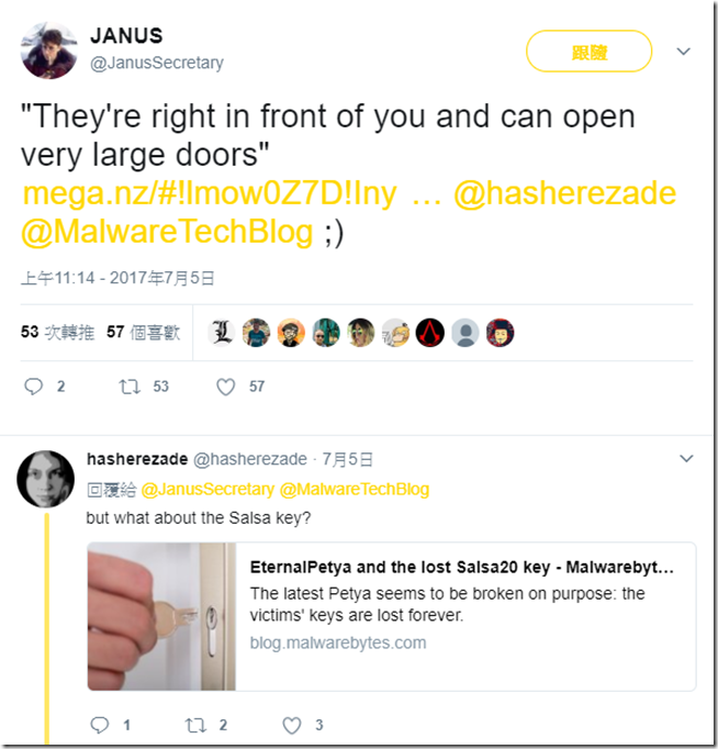 疑似為勒索病毒 Petya 的作者(團隊可能)Janus Cybercrime Solutions,日前在他們的推特上寫下了一段話「They’re right front of you and can open very large doors(他們就在你眼前,你可以用來打開非常多的門)。」同時附上一個 Mega 的網路空間網址,裡面存放的正是勒索病毒 Petya 的解密金鑰。