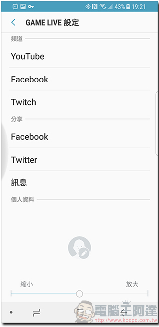 在設定的部分可以自訂 Twitch 、 Facebook 、 YouTube 三大串流頻道的直播帳號,以及使用 Game Live 直播時是否用手機麥克風收音、同時錄製影像等,非常方便!