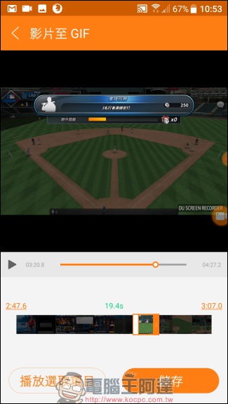 下面就是實際用DU Recorder App 錄製《MLB 9局職棒 17》的遊戲畫面,並且加入攝影機錄製使用者的畫面。雖然 App 可以錄製螢幕,但聲音的部分是透過外部的麥克風收音,因此筆者開著電風扇錄音的聲音被收進去,歡呼跟生氣的聲音也同樣收進去,而遊戲的部分,必需先把聲音開大,才能收到聲音,但因為是從手機喇叭發出,手機麥克風收入,所以音質很難有更好的表現,這點或許是目前手機 App 螢幕錄影的問題所在: