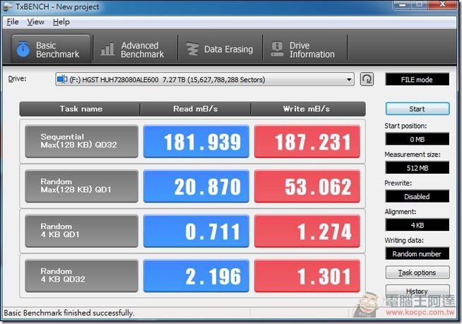 TxBENCH是一套測試硬碟/ SSD 表現的軟體,可看出 HGST Ultrastar HE8 循序讀取速度達 181.9MB/s;寫入為 187.2 MB/s,隨機寫入的表現優於讀取: