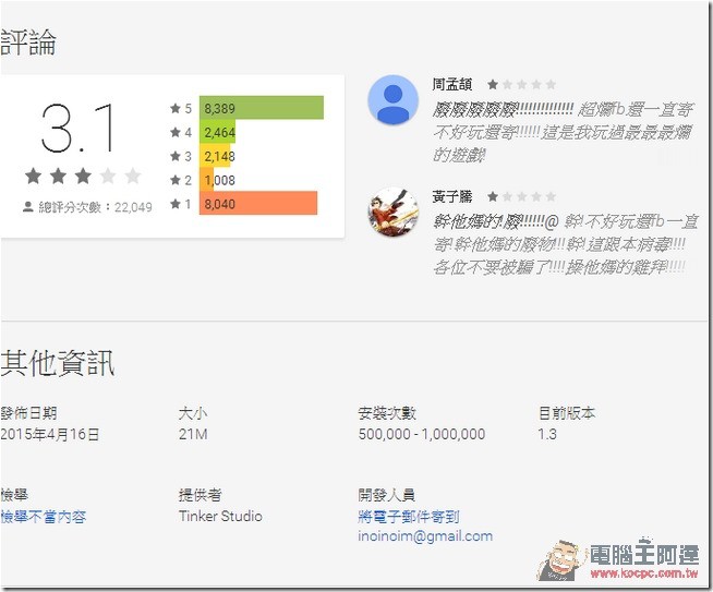 ↑遊戲下載次數已經突破50萬關卡,但是評價一星的數量也是非常的高。