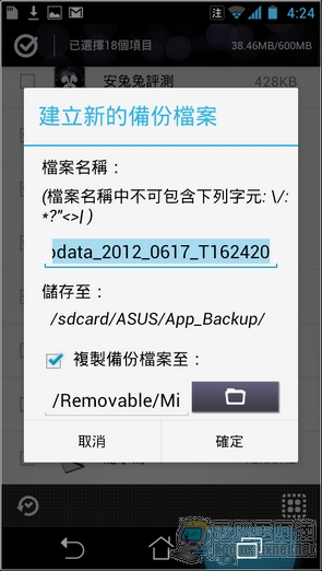 很多人ROOT手機就是為了備份APP與裡面的資料,在最新版的PadFone韌體中就內建了「App備份」,可將軟體與裡面的內容備份下來,以後遊戲進度就不怕遺失了: