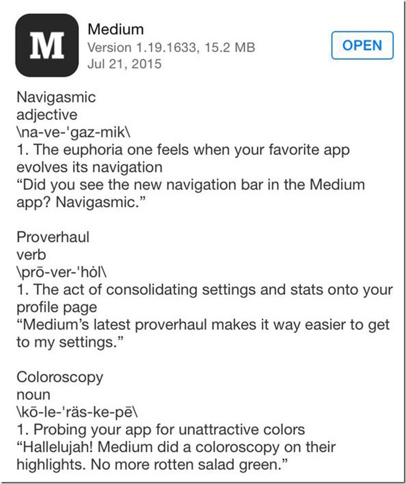 國外軟體中,Medium 也算是一個非常喜歡惡搞更新日誌的廠商,向他們在這邊自己擅自發明了一堆奇怪含意的文字: