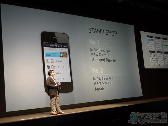首先報告了LINE前陣子剛推出的幾個服務,如與LINE公仔一起拍照的「LINE CAMERA」、增加新表情符號的「貼圖小舖」與追蹤藝人動態的「官方帳號」等內容。而「貼圖小舖」這個付費內容更是在各個主要的國家都獲得了相當大的迴響,分別在台灣、泰國取得暢銷付費軟體第一的成績,日本國內也有第二名的佳績: