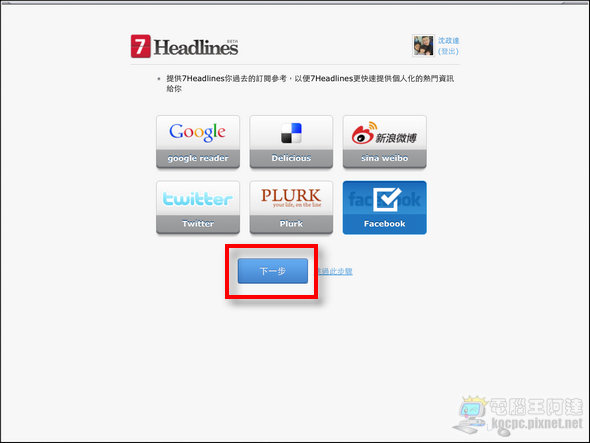 登入後可以繼續設定其他的社群軟體訂閱資料,如TWITTER、PLURK等等(我個人測試最多只能勾兩個,但看別人好像可以全梭,原因不明),設定後點選「下一步」: