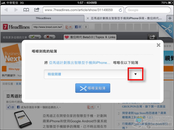 舉例來說您看到某一則新聞覺得很喜歡想記錄下來,以往是將其加到最愛,但這樣長久下來光整理書籤就很麻煩,在「7Headlines」中只要點擊文章右上角的「剪刀」圖示就可以將文章快速儲存到分類過的剪貼簿中: