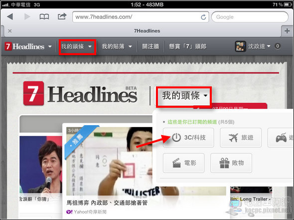 在一開始我們設定了想閱讀的頻道內容,在您想切換讀取各頻道的新文章時,只要點擊「我的頭條」選項就可以快速切換所有訂閱的頻道: