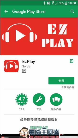 我們都會有用手機聽歌的時候,音樂的來源中,除了自己下載的以外,就屬 Youtube 等影音平台上最多。但用 Youtube 或其他影音網站聽歌都有個缺點,不管是網頁還是 App ,都不適合關掉螢幕時聽歌,必須放著螢幕在那裡亮著。如果只是單純睡不著想聽點輕音樂,又不希望手機的亮光打擾睡眠,似乎就缺乏一種兩全其美的方法。但以 Android 平台來說,辦法還是有的,就是一支叫做《 Ezplay 》的 App: