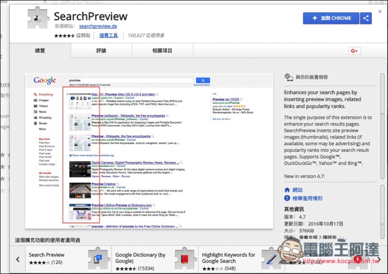 SearchPreview 是一款免費擴充外掛,點我進 Chrome 安裝頁面後,點選右上角 “+ 加到 CHROME“ 進行安裝: