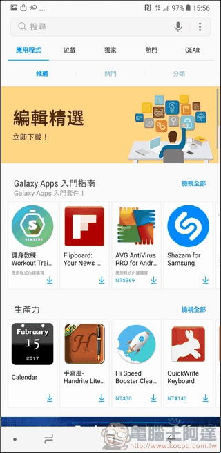 Note8 搭載了最新的 Android 7.1.1 與 Samsung Experience 8.5 版,內建應用以實用為主,不像之前塞了一堆應用,而是有需要時使用者再自行到 Galaxy Apps 下載。眼尖的朋友可能會發現怎麼沒看到 Note 之前主力應用「S Note」與「全能貼」怎麼不見了,他就是要使用者由 Galaxy Apps 自行下載安裝: