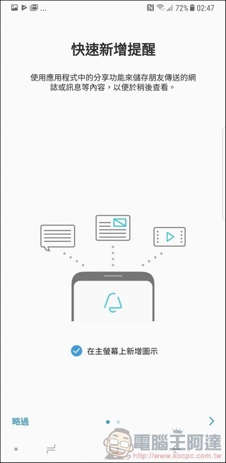 Bixby Remind 是一個相當實用的記事提醒功能,他可以很快速的新增提醒,並設定提醒條件,包含了提醒時間或你離開或抵達特定地點時跳出顯示,以後不管是離家前或是到達超商時就不會忘東忘西了: