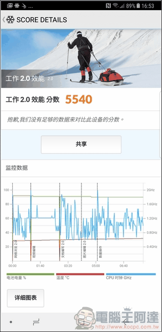 續航力部分,以 PCMARK 2.0 模擬上網、文書、修圖等動作循環壓力測試,由 100%到 20% 測得 9 小時 10 分的表現,預估至少有 10.5 小時以上的續航力,雖然 Note8 為了安全考量被三星刻意限縮了電池容量,但以旗艦手機來說還算是相當不錯的表現: