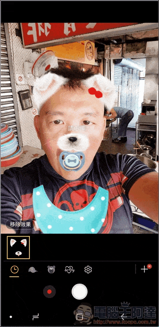 自拍時在畫面下方中央會有每顏效果調整,可調整氣色、光線、瘦臉、大眼…等效果,效果不算太浮誇,不會拍了之後連老媽也不認識自己: