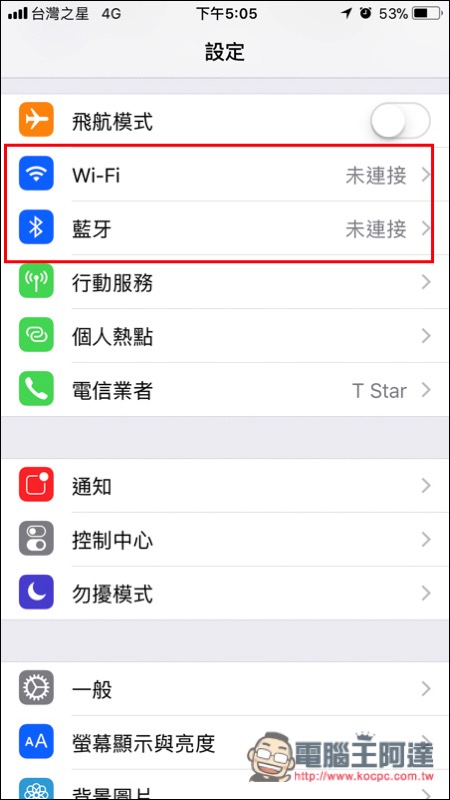 進到設定後你會看到,Wi-Fi 與 藍牙這兩個選項,是顯示 “未連接”,而不是 “關閉”: