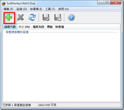 STEP3.安裝後執行SoftPerfect RAM Disk,先選擇左上角的「+」設定一個RAMDISK: