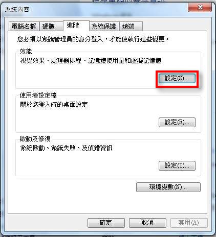 另外小筆電的用戶筆者建議可以將一些不太重要的視覺效果也關閉掉,首先在系統內容中選擇進階–>效能–>設定–>視覺效果: