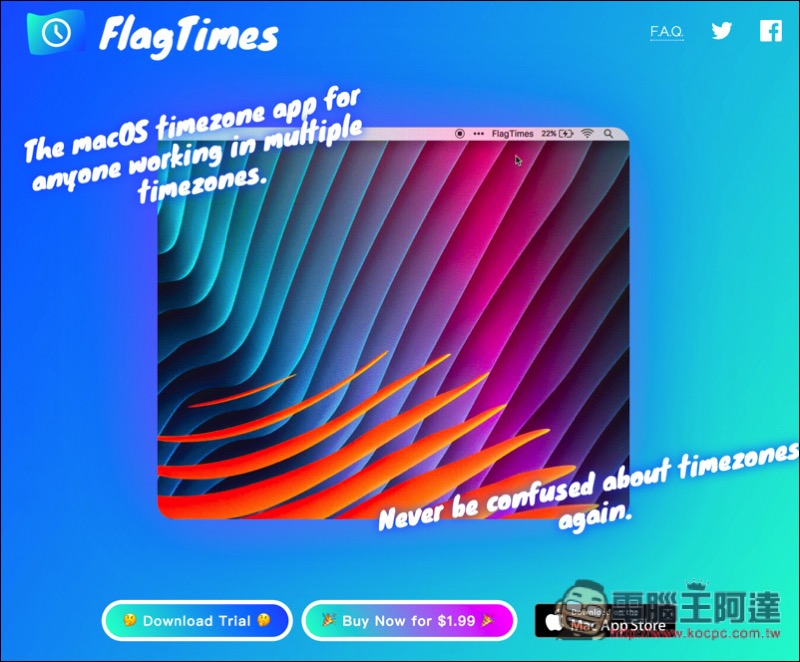 雖然市面上有非常多世界時鐘的 App 工具選擇(像是 Hour 這款),但絕大多數都是需要打開該 App 選單,才能查看到各國的時間,只是多了這動作對某些讀者來說,可能會覺得麻煩,畢竟以前查電腦時間直接看右上角即可。如果你是這樣的人,那這篇要介紹的 Flagtimes 工具你絕對會喜歡,它會直接在 Menu Bar 上顯示各國國旗與時間,因此不需操作任何事情,一眼就能得知他國家的目前時間。