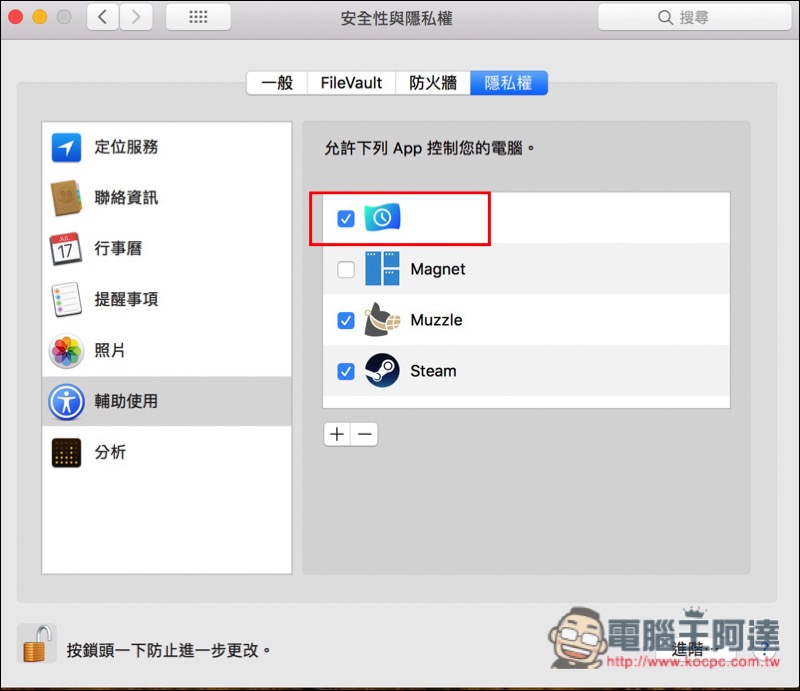 這是隱藏 Mac 內建時間的功能,如果你也把自己的國家加入到 Flagtimes中,那內建的時間就不需要,即可透過這功能來關掉,不過必須先授權它,點選 Add Permissions:
