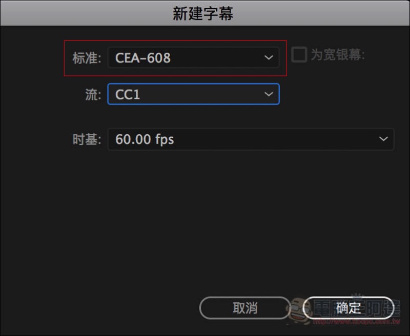 會跳出一個新視窗要我們選擇標準、流以及 Fps,下面兩個可以不用理它,唯一要注意的是標準,共有四個選項 CEA-608、CEA-708、圖文電視以及開放式字幕: