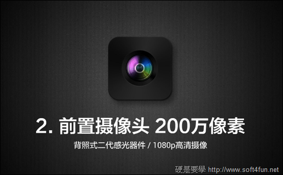 前鏡頭使用背照式 CMOS 感光元件,有助於畫質上的提升。畫素也達到 200 萬畫素。
