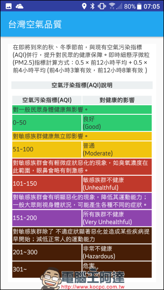 ▲空汙指標有 PM2.5 濃度指標跟 AQI 指標兩種,這些在環保署官網也都查得到,但 App 直接附上說明,省下一道開瀏覽器查詢的功夫。