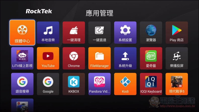 下圖是RockTek X5的操作介面,相當乾淨清爽,主要分成兩個區塊,上方為主應用程式列表,每個應用僅透過小圖示 + 中文名字搭配顏色區塊呈現,我很喜歡這樣的設計,看起來非常的舒服。下方是快捷應用列表,只會顯示小 icon。而系統也已內建好兩個目前台灣數一數二大的服務商:「LiTV」、「愛奇藝影音」,有非常多影音內容可以觀看,當然,Youtube 也沒缺少。而聽歌部分也已安裝好 KKBOX,只要登入隨附的體驗帳號,就能盡情聆聽 21 天的免費音樂: