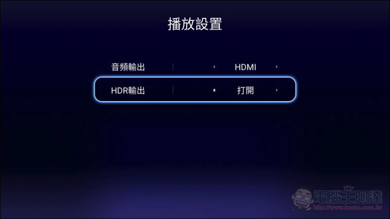 這台支援 HDR 輸出,不過預設是關閉狀態,因此如果你的電視有支援,記得進到播放設置裡把 HDR 輸出打開:
