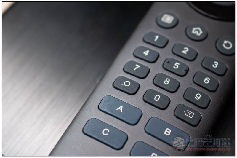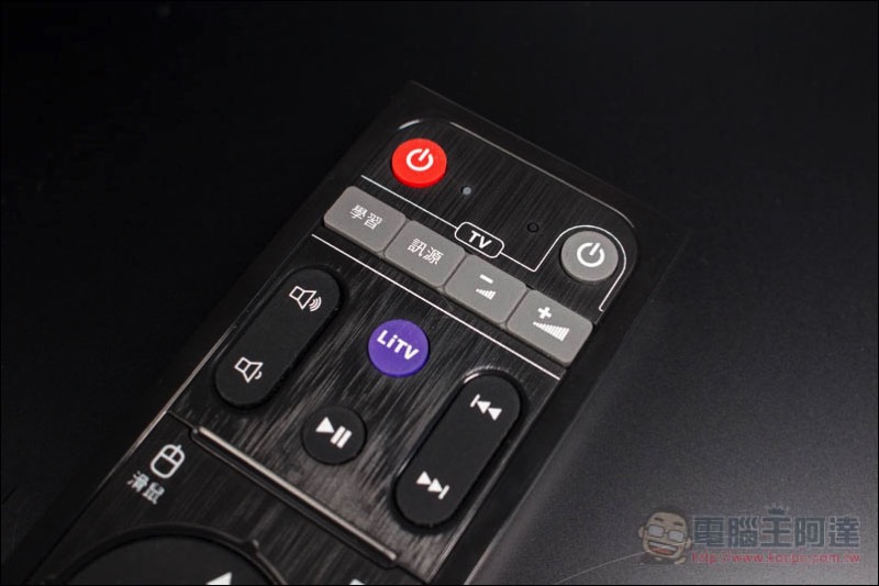 遙控器表面一樣有髮絲紋設計,編排方式也很合理,有關影音調整都在上方,如:大小聲、播放/暫停鍵等,另外也特別獨立一顆 LiTV 鍵,按它一下就會快速開啟 LiTV App: