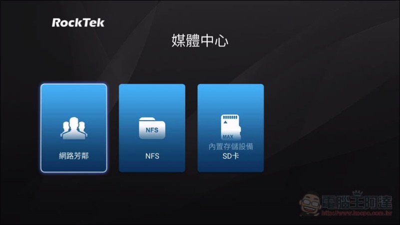 媒體中心可說是電視盒中,我最看重的功能之一,因為我經常會看自己硬碟、NAS 中的影片,所以支援性好不好非常重要。而 RockTek X5內建網路芳鄰、NFS 以及 SD 卡三個選擇,可說相當齊全,網路芳鄰可連接家中的 NAS、NFS 來播放 PC 的內容、SD 則是讀取記憶卡的內容: