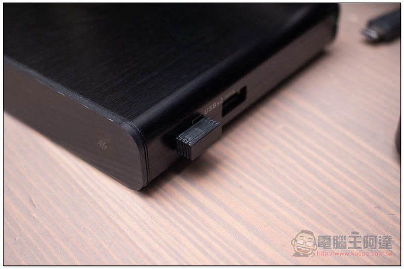 機身採用一體化鋁合金材質製成,實機質感非常的好,可說是目前我看過的電視盒中最棒的,特別是那髮絲紋設計,加強了整體精緻感。四周邊緣處也有做圓角處理,讓它看起來不至於太過於科技感: