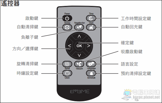 EMEME Tulip100隨機附贈的多功能遙控器,可控制EMEME Tulip100的所有動作: