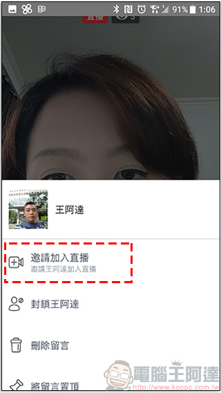 點選對方大頭,會進到下一層選單,直接點選「邀請加入直播」。