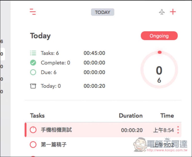 新增完的任務都會列在下方,有設置工作時間的名稱後面會標示 for 多少時間,像是下圖的 公司簡報 for 00:30m: