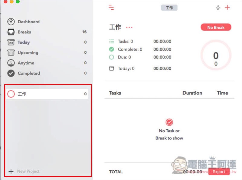 點選右上角的 +,即可新增工作任務,輸入名稱、開始時間、是否要歸類到哪個專案裡、以及工作時間,不知道會花多久工作時間的話就選擇 No duration: