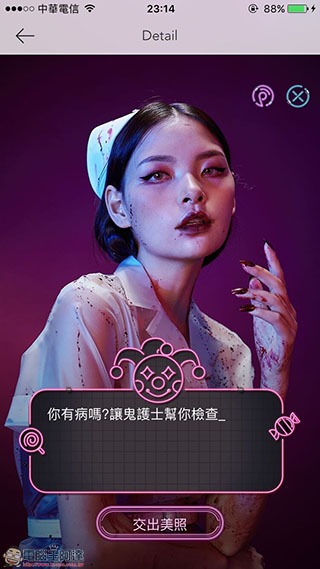 我猜會有人問,那初始圖片上面「萬聖節鬼妝」按鈕按下去會跑出什麼?我真的很想留給大家自己體會,全貼上來就不好玩了,所以只貼一、兩張讓大家感受一下,按下去是什麼狀況(手機不會爆炸不用擔心xD)