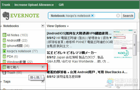 之後再進入EVERNOTE的「雜七雜八」中就可以看到剛剛新增的文章了: