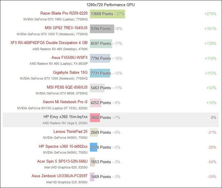 關於筆電版 Ryzen APU 目前能知道的資訊相當有限,雖然先前的文章中,我們已經大致介紹了官方放出的訊息,但這個處理器的真正效能到底落在哪個階段,大家都很在意。一般推測, 筆電版 Ryzen APU 應該要有相近於 Intel 同等級筆電處理器的實力,像是 Ryzen 5 APU 應該跟 Core i5 的筆電版相當。而國外媒體 Notebookcheck 最近取得了剛宣佈推出Ryzen APU 版的 HP Envy x360 15 的 AMD 版本樣機,進行了 Benchmark 測試,而得到了筆電版 Ryzen 5 2500U 的 GPU 與 CPU 成績: