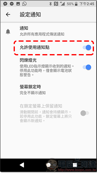 3. 把「允許使用通知點」這一項關閉,如此一來就可以使通知點從此不再出現。