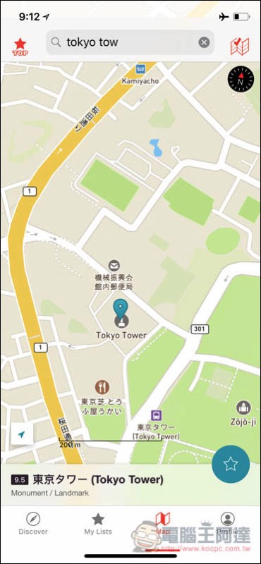 下圖就是它的操作介面,主要功能表位於下方,分別是 Discover 發現、My Lists 我的清單、Map 地圖以及 Profile 個人,一開始也會有簡易操作介紹,看不懂沒關係,下面我會教你怎麼離線下載地圖。首先是點選上方的 Search 搜尋欄位: