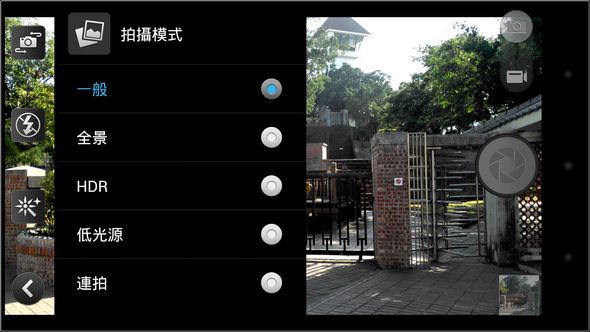 其實Acer CloudMobile S500讓我最覺得滿意與好用的是他的照相功能,雖然傳言他使用了與ONE X同等級的鏡頭,但是實際的成像效果與對焦能力卻比我之前測過的ONE X好非常多,除了可拍攝800萬畫素的照片與F2.2大光圈,錄影更是有720P 60FPS、1080P 30FPS的能力,並支援邊錄邊拍、HDR、全景攝影、低光源等拍照模式,接下來先看一下S500的攝錄界面。
