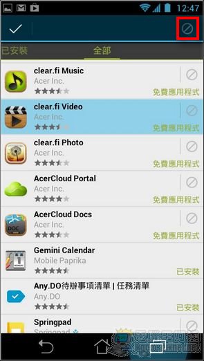 接著選擇「我的應用程式」裡面的全部,就會看到自己曾經裝過的軟體清單。以我為例,我寫了三本Android好用軟體300+,其中為了試驗大概測超過1000套以上,真的是看到眼睛拖窗,首先隨便選擇現在沒有安裝也沒有使用的App再按住不放,接著在最上面就會出現刪除的圖示,點擊下去: