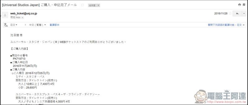 支付完成後,就會立刻收到官方寄來的行程確認通知,相關訂購憑證(也就是門票,你要自己印出來),大部分都會在一、兩天內收到。像我定日本環球影城就會收到門票、Fastpass 票券(需印出隨身攜帶)與內容相當清楚的 Fastpass 內容資訊(這點很重要,原因後文報告):