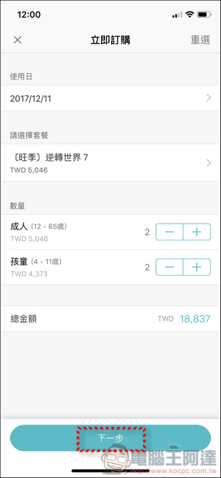 選擇套餐後就會有目前所有還能買的的組合,由於我是12月出發,當時在日本也是旺季,所以很多組合像「飛天翼龍 7」都沒了(而且Fastpass 也比較貴,平日價格比較便宜),所以我退而求其次選擇還有票的「逆轉世界7」(主要差在不能直接玩飛天翼龍,不過去年玩過了所以還好),接著設定人數後就會統計出金額,接著執行「下一步」: