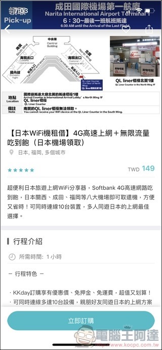 我這次選擇的是日本機場領取的日本WiFi上網吃到飽方案,一天才149元,租借五天不到750元,優點是免 APN 設定、在日本下飛機後直接領取開機就能用:
