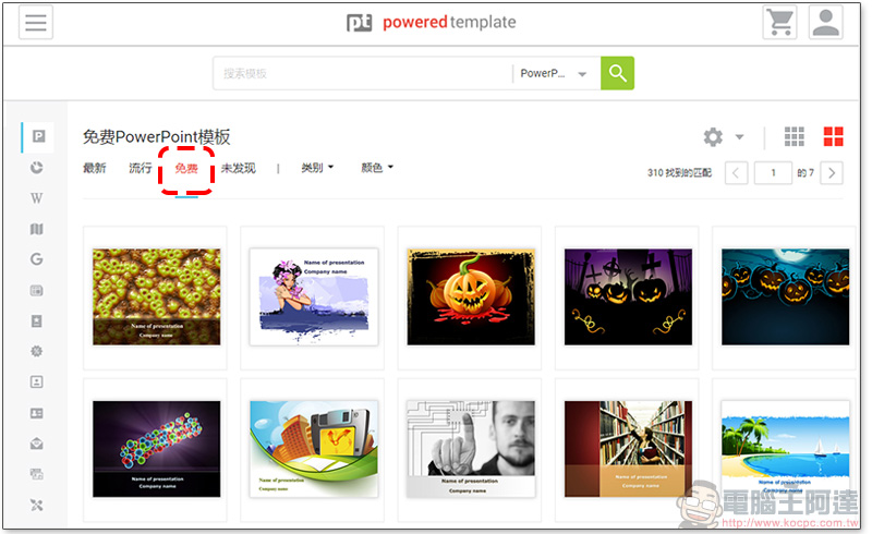 這裡先以 PPT 為例來說明下載流程,點選 PowerPoint 模板後進入的頁面中,我們上面的顯示條件選擇「免費」,網站系統會自動顯示免費項目,你還可以從旁邊的類別、顏色進一步篩選。