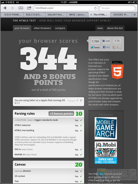 HTML5支援度測試,new iPad的HTML5(html5test.com)得分為344分,PadFone2得分為390分也是PadFone2比較高: