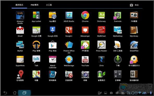 您在「應用程式」與「小工具」中間有一個華碩獨家的「PAD應用」,他可以讓您指定部分非常適合平板介面的App將其分類到平板專用,只要在程式集裡面按住APP捷徑不放,並拖曳到「新增Pad專用標籤」: