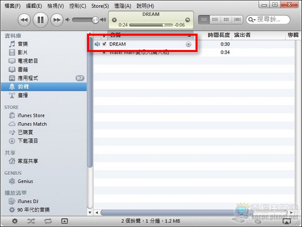 之後在iTunes的「鈴聲」中就可以看到剛剛產生的鈴聲,之後與iPhone同步就可以使用了: