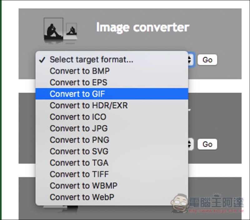 這網站能轉的格式實在太多,因此就以一個我比較常用的影片轉 GIF 作為介紹。首先要注意是,一般想到影片轉 GIF,應該都是進到影片 Video converter 中選擇,但事實上 GIF 是在圖片 Image converter 裡,所以說這網站的規則是,從想要轉換成的格式來選擇,跟來源沒有關係。選定之後按 Go 進到下一頁: