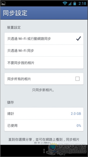 臉書又推出新功能了,這是增加的主要功能是新增照片自動上傳功能,在臉書Play 商店的說明甚至都沒寫出來,但只要打開臉書就可以看到最上方新增了一個「同步手機相片到Facebook」的功能,臉書提供了每個使用者2GB的相片儲存空間,雖然不大,但上傳到臉書的照片都會經過縮圖,所以應該還夠用,筆者猜測日後會有付費增加空間的服務。